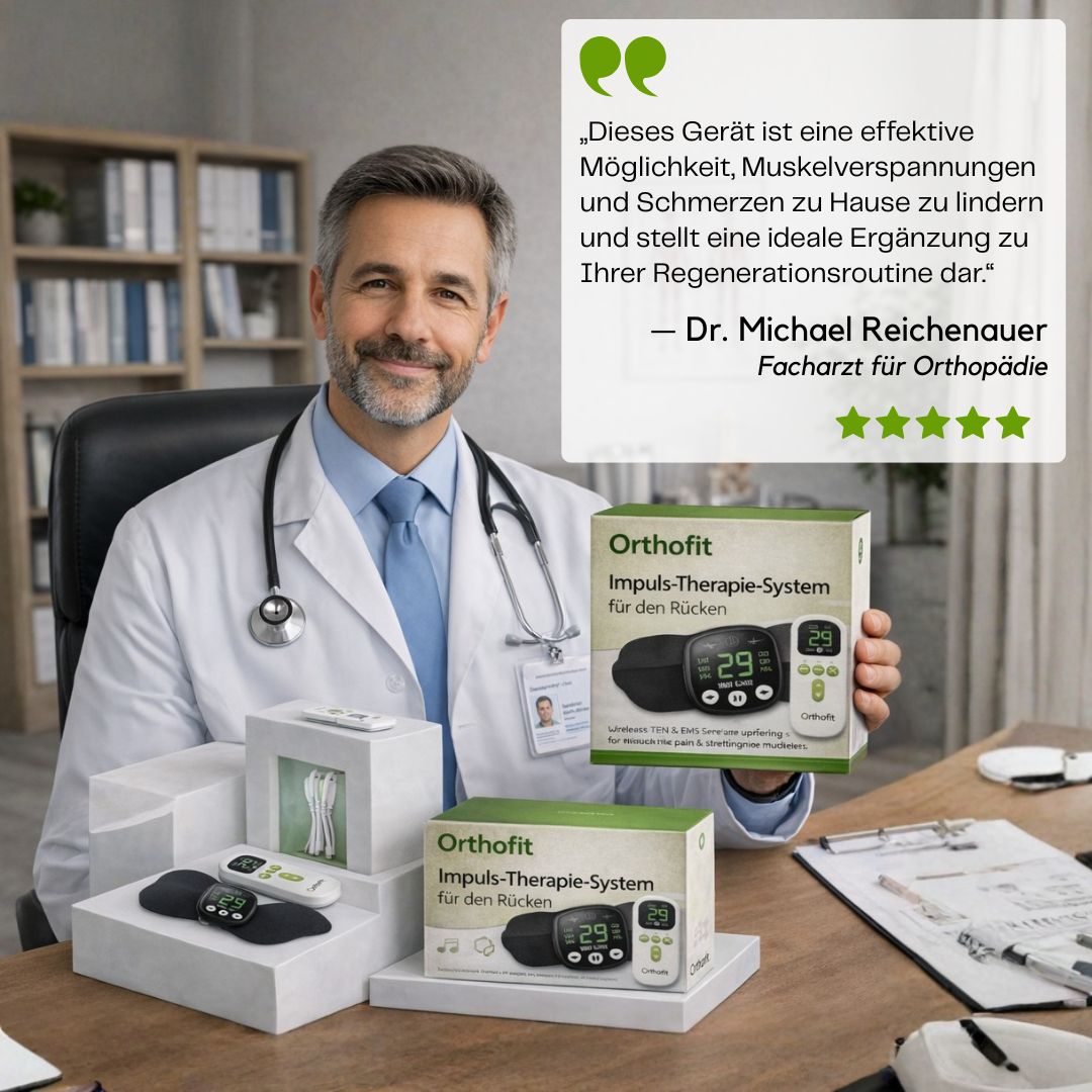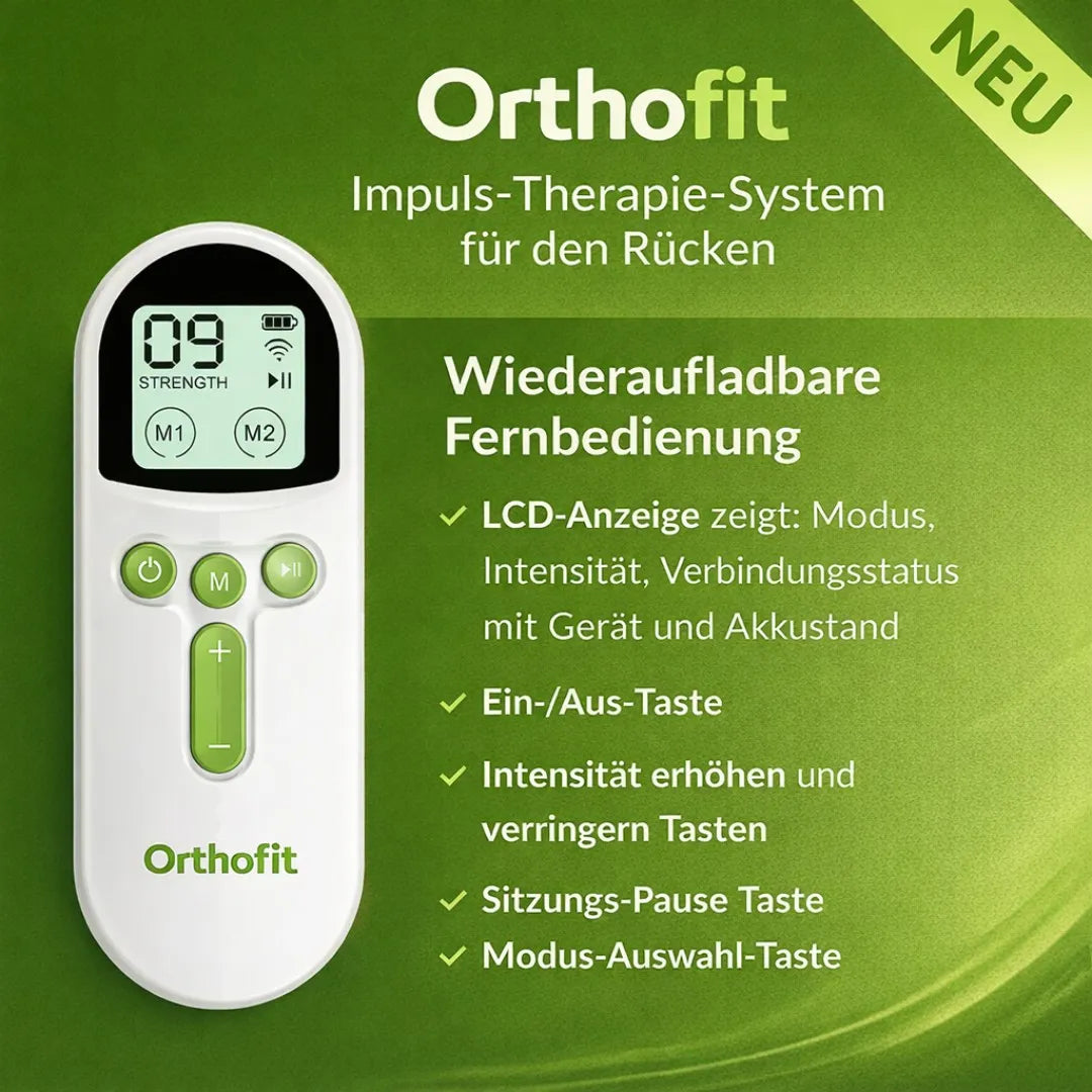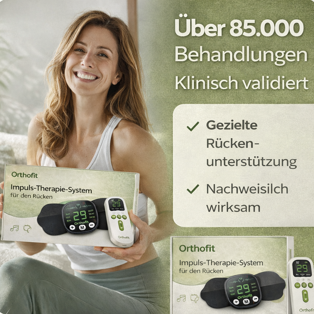 Das Orthofit Impuls-Therapie-System wurde entwickelt, um verspannte und überlastete Rückenbereiche gezielt mit elektrischen Impulsen zu stimulieren. Die Impulse aktivieren die Muskulatur, lockern verhärtete Bereiche und können dabei helfen, Spannungsgefühle, Steifheit und alltägliche Rückenbelastung spürbar zu reduzieren.